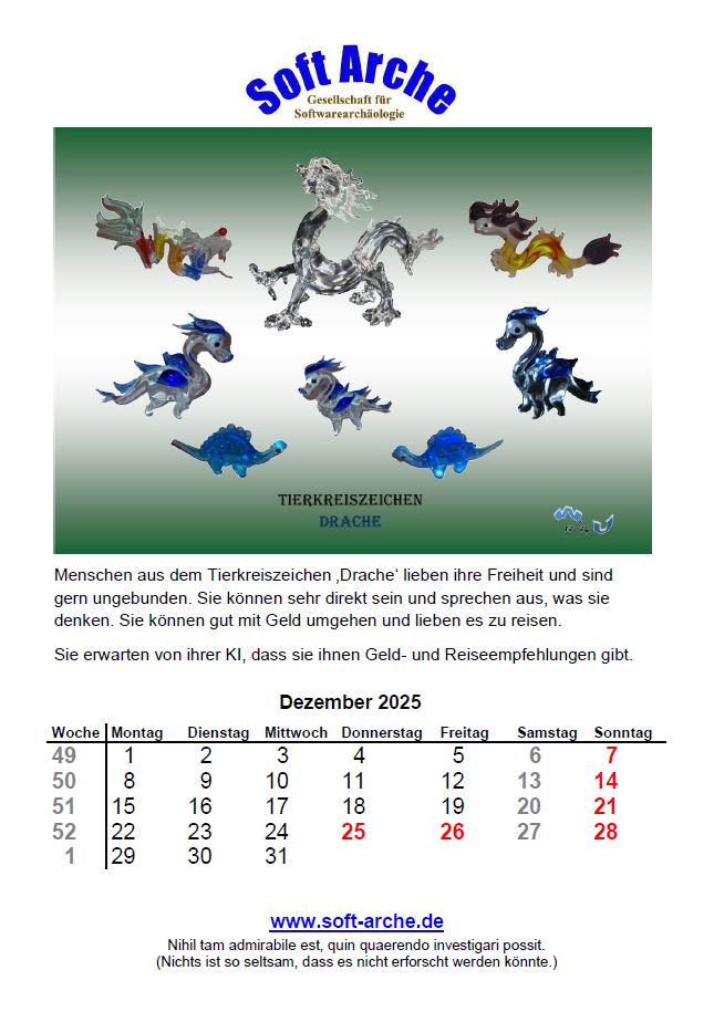 Sie genügen dem Motto des SoftArche-Kalenders ‚Nihil tam admirabile est, quin quaerendo fingere possit.’ (Nichts ist so seltsam, dass es nicht dargestellt werden könnte.).